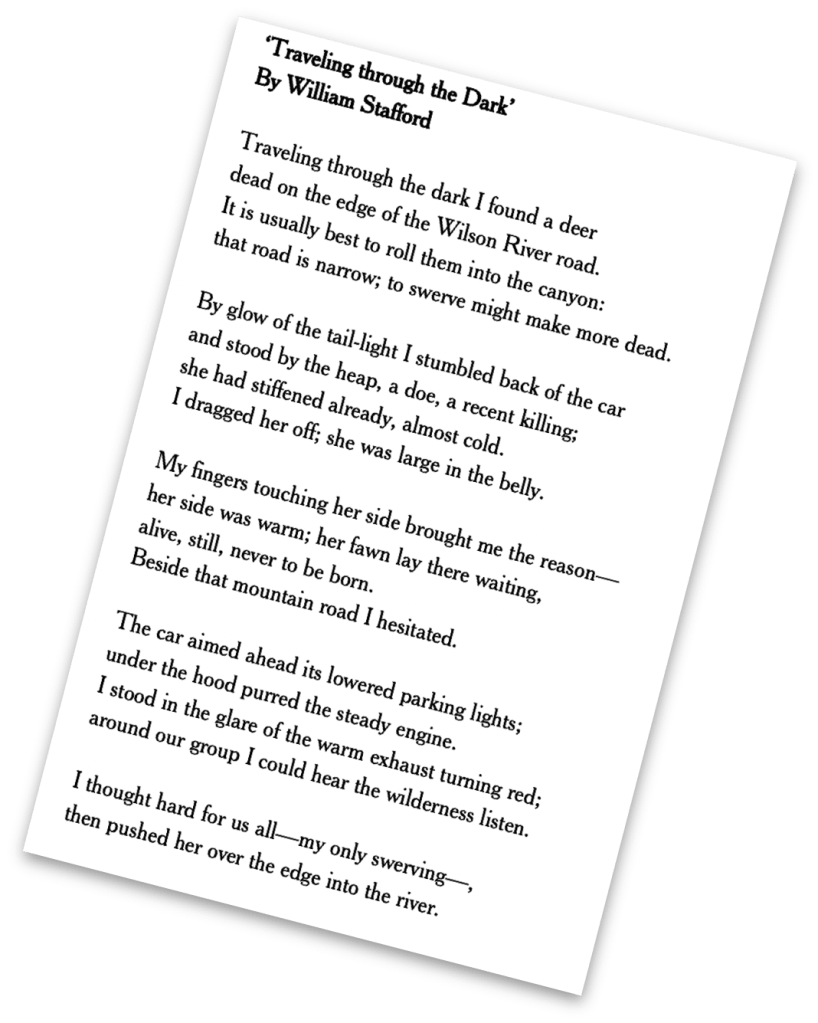 The poem ‘Traveling Through The Dark’ by William Stafford is one of my favourite poems to share in class. The narrator explains how a journey along the ‘Wilson River road’ is interrupted by the discovery of a dead deer. On further inspection, he realises the doe is carrying a fawn, ‘alive, still, never to be born.’ It’s a beautifully simple example of free verse that evokes a singularly disturbing moment and it always resonates with students.